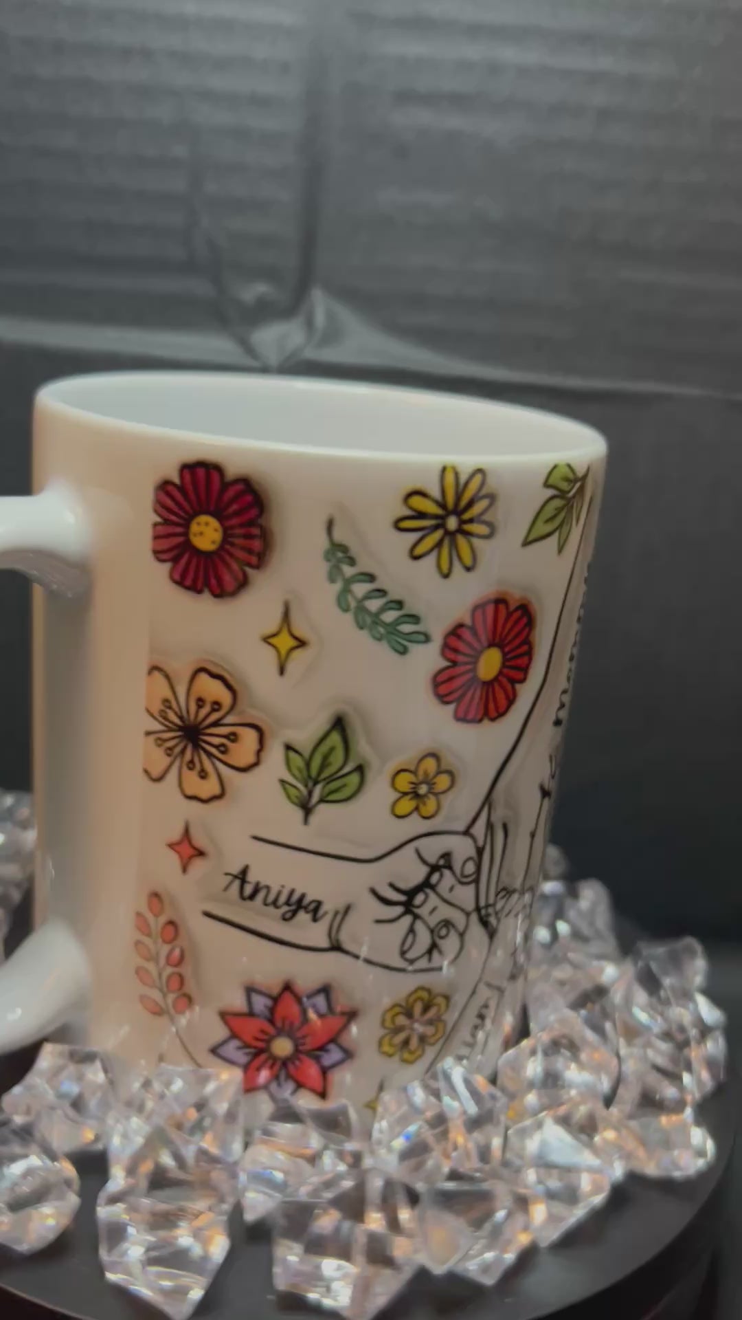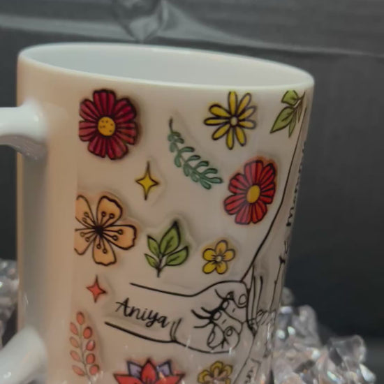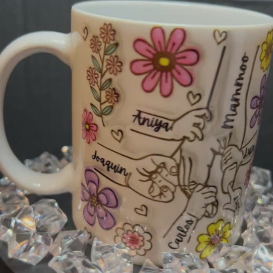 You can get any title such as “mom, nana, Mimi, Gigi, etc added to the mug just add in the personalization box along with names you would like on fingers.